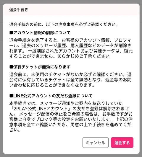 本手続きでは、メッセージ通知やご案内をお送りしていた「2PLAY公式LINEアカウント」の友だち登録は解除されません。 メッセージ配信の停止をご希望の場合は、お手数ですがお客様ご自身でブロック等の設定をお願いいたします。 上記の注意事項を全てご確認いただき、同意の上で手続きを進めてください。